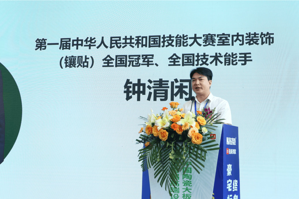 第一届中华人平易近国技术大赛室内粉饰(镶贴)全国冠军钟安逸专家颁发了致辞。